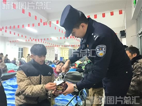 2024年1月23日,民警在安置点提着开水壶帮群众冲泡方便面。