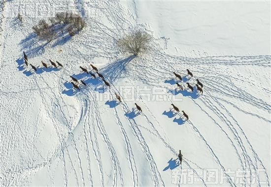那拉提草原雪地如纸,群马在雪海之上踏出一串串印记,洒下无数闪耀的剪影,画出了一幅幅动态图画(2023年11月14日无人机摄)。