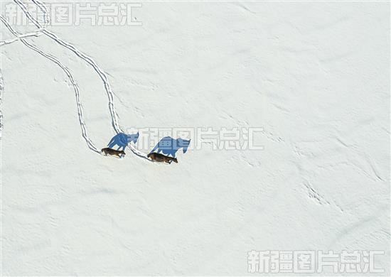 那拉提草原雪地如纸,群马在雪海之上踏出一串串印记,洒下无数闪耀的剪影,画出了一幅幅动态图画(2023年11月14日无人机摄)。