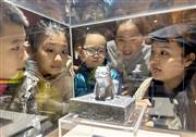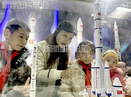 2024年2月4日,大学生志愿者带领小朋友在乌苏市科技馆航天科技展厅参观。