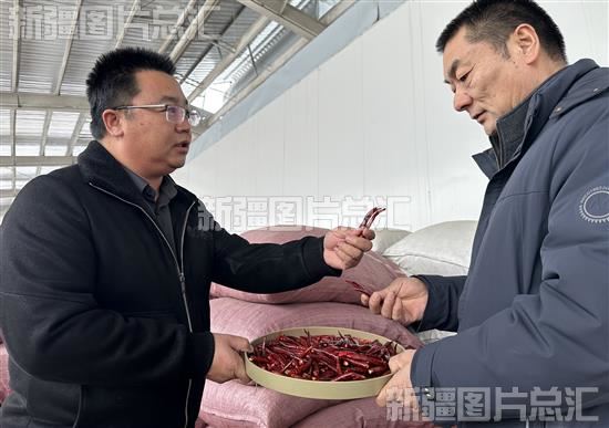 2024年2月2日,新疆椒阳生物科技有限公司负责人李伟军(左)向客户介绍不同辣椒品种的特点。