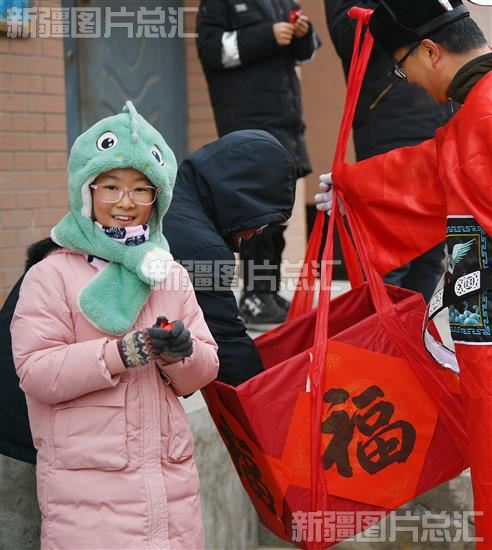 2024年2月2日,送福人挑着装满红枣、核桃和葡萄干的礼包,给小朋友送去节日礼品。