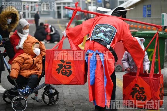 2024年2月2日,送福人挑着装满红枣、核桃和葡萄干的礼包,给居民送去节日礼品。