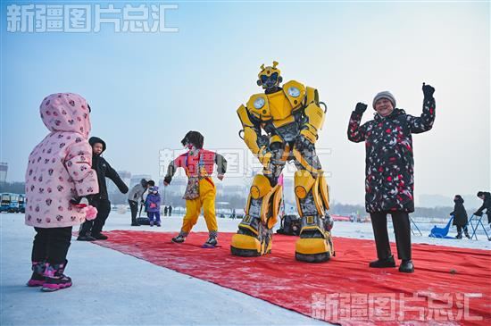 2024年1月31日,游客在昌吉市冰湖河中央公园参与互动表演。