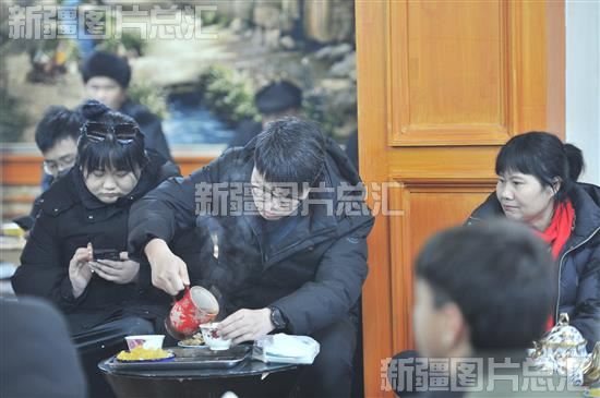 2024年2月6日,游客在位于喀什古城吾斯塘博依街的百年老茶馆里斟茶。