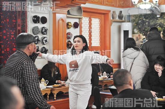 2024年2月6日,游客在位于喀什古城吾斯塘博依街的百年老茶馆里跳舞。
