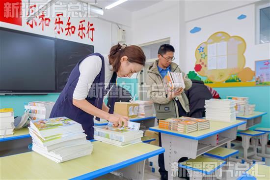 2024年2月18日,昌吉市第十九小学教师在清点教材。