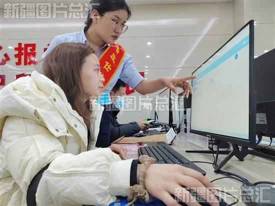 2024年2月18日,伊宁市政务服务中心工作人员在自助服务区协助市民办理业务。