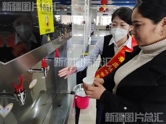 2024年2月18日,伊宁市政务服务中心工作人员协助市民使用饮水机。