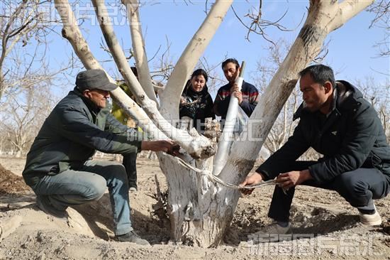 2024年2月17日,农技人员在乌什县奥特贝希乡苏盖特力克村林果业基地帮助群众做好果树防风防寒工作。
