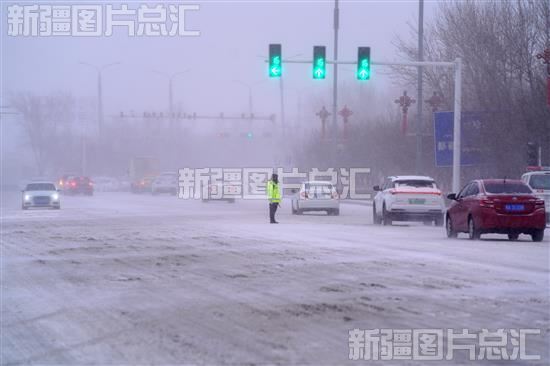 当日,哈密市遭遇大风大雪天气,市区风力达到8级左右,交警坚守岗位,确保道路交通秩序井然。