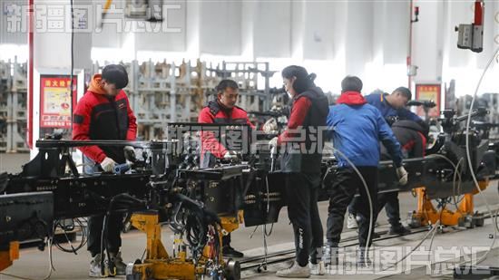 2024年2月19日,工人在位于乌鲁木齐经济技术开发区(头屯河区)的陕汽新疆汽车有限公司生产车间组装汽车底盘。