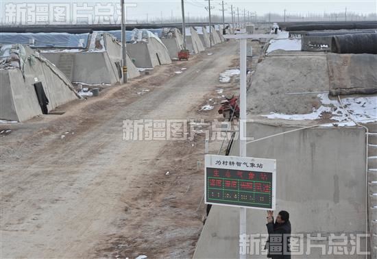 2024年2月15日,工人在喀什市现代农业产业园温室大棚外调试气象站电子屏。