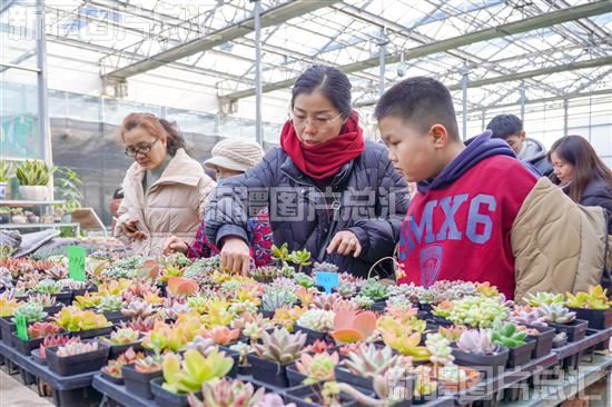 2024年2月14日,游客在昌吉国家农业高新技术产业示范区新疆农业博览园蝴蝶兰展馆内选购多肉植物。