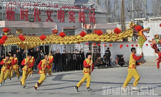 2024年2月14日,疏附县兰干镇苏鲁克村舞龙队为村民表演舞龙。