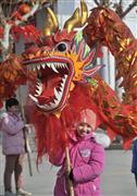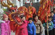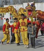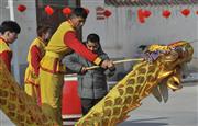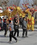 2024年2月14日,疏附县兰干镇苏鲁克村的小学生在该村舞龙队的指导下练习舞龙。