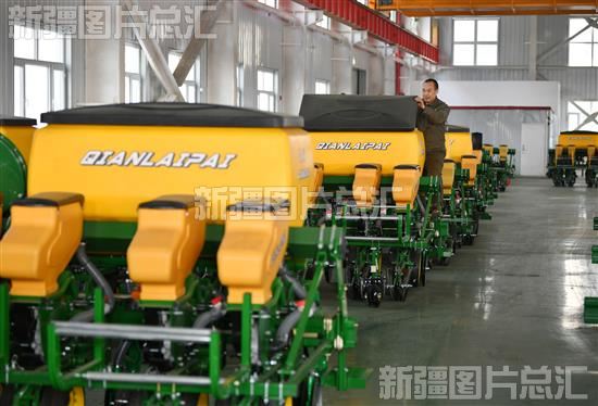 2024年2月19日,工作人员在伊犁播立得农机制造有限公司生产车间查看组装完成的播种机。该公司生产的气吸式精量免耕播种机主要用于玉米、黄豆、高粱等多种颗粒农作物精量播种,产品畅销伊犁、塔城、阿勒泰等地。