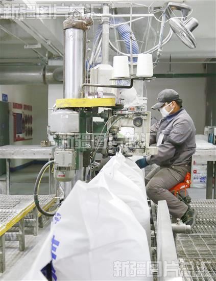 2024年2月19日,位于库车市经济技术开发区的阿克苏华锦化肥有限责任公司员工操作封包机打包袋装化肥。