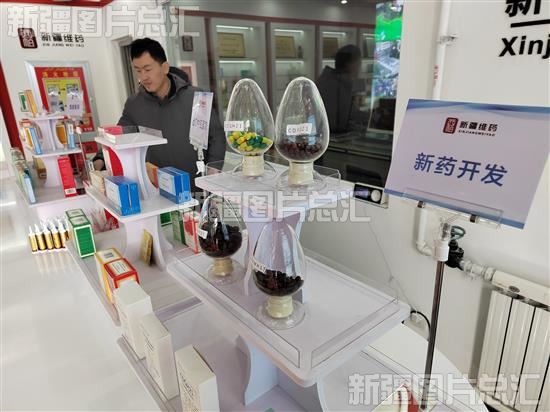 2024年2月21日,工作人员在位于乌鲁木齐高新区(新市区)的新疆维吾尔药业有限责任公司展示厅摆放各类产品。