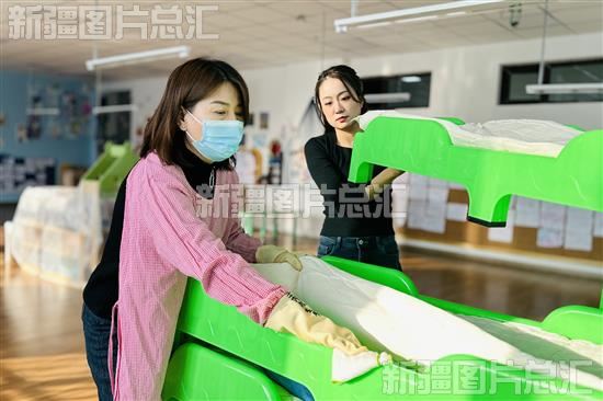 2024年2月19日,昌吉市第十一幼儿园教师对教室内的幼儿床进行保洁。