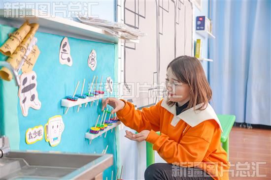 2024年2月25日,昌吉市第二十一幼儿园的教师在布置教室,迎新小朋友返园。