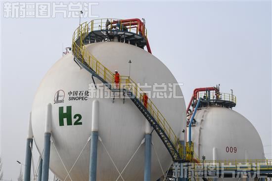 2024年2月22日,工作人员对中国石化新疆库车绿氢示范项目绿氢储存罐进行巡检。