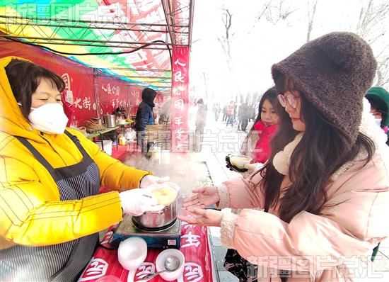 2024年2月24日,市民在乌鲁木齐市人民公园年货大街上品尝免费汤圆。