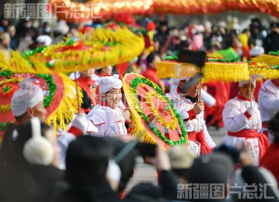 2024年2月24日,演员在乌鲁木齐市人民公园朝阳阁广场表演社火。