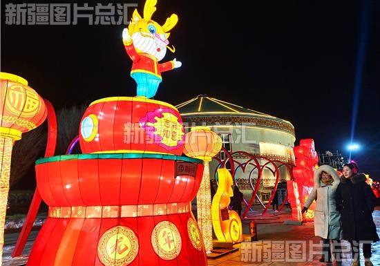 2024年2月23日晚,市民在裕民县锦裕民生公园观赏花灯。