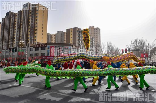 当日,沙雅县举办元宵节社火表演,当地干部群众走上街头舞龙舞狮,载歌载舞,欢庆元宵节。