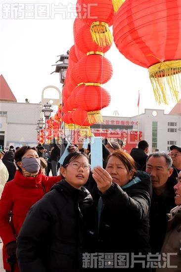 2月24日,新疆生产建设兵团第二师22团河畔镇职工群众在活动现场猜灯谜。