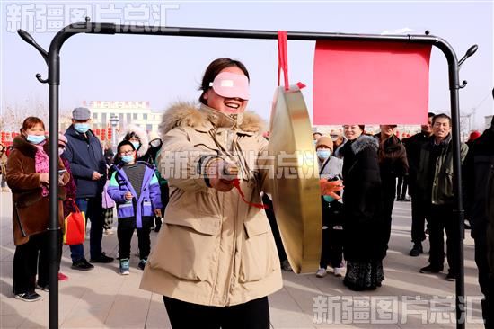 2024年2月24日,新疆生产建设兵团第二师22团河畔镇职工群众在活动现场玩蒙眼敲鼓游戏。