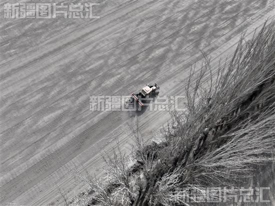 2024年2月26日,新疆生产建设兵团第二师21团六连职工驾驶农机播种春小麦(无人机摄)。