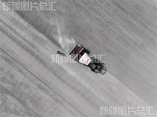 2024年2月26日,新疆生产建设兵团第二师21团六连职工驾驶农机播种春小麦(无人机摄)。
