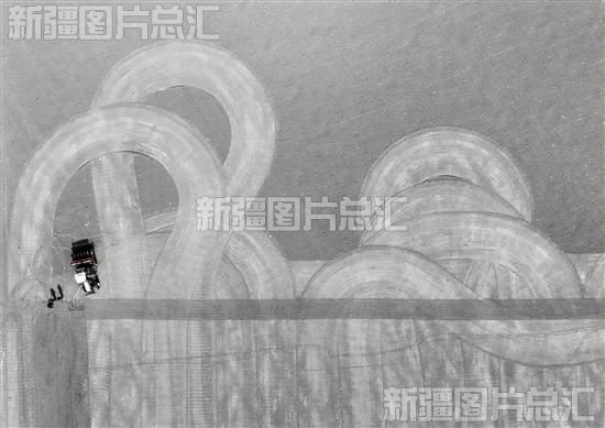 2024年2月26日,新疆生产建设兵团第二师21团六连职工驾驶农机播种春小麦(无人机摄)。
