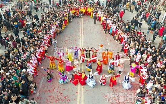 2024年2月23日,精彩的社火表演吸引了各族群众观看(无人机拍摄)。