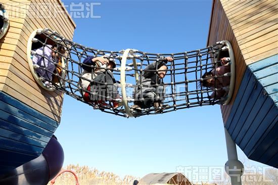 2024年2月10日,小朋友在巴州博湖县大河口景区游乐场玩耍。