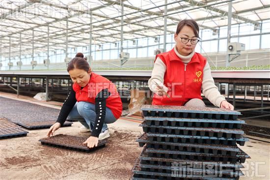 2024年2月27日,国家税务总局库车市税务局驻牙哈镇苏盖特力克村工作队队员和村民在育苗基地管护蔬菜苗。