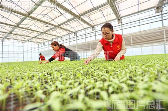 2024年2月27日,国家税务总局库车市税务局驻牙哈镇苏盖特力克村工作队队员和村民在育苗基地管护蔬菜苗。