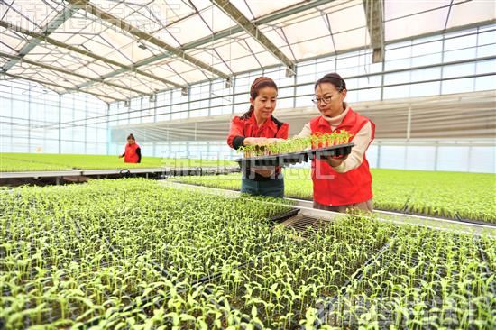 2024年2月27日,国家税务总局库车市税务局驻牙哈镇苏盖特力克村工作队队员和村民在育苗基地管护蔬菜苗。