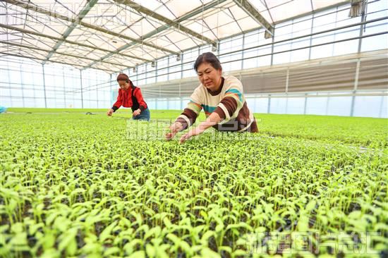 2024年2月27日,国家税务总局库车市税务局驻牙哈镇苏盖特力克村工作队队员和村民在育苗基地管护蔬菜苗。