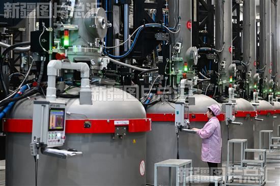 2024年2月27日,位于克拉玛依市乌尔禾区硅基新材料产业园的新疆晶品新能源有限公司生产车间内,工人正在查看设备运行情况。