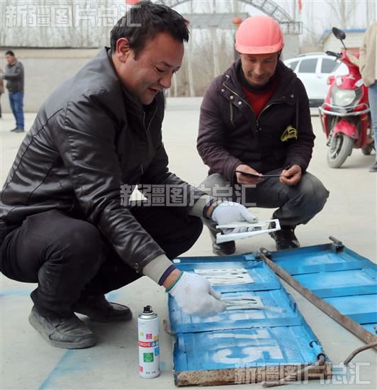 2024年2月27日,工作人员给拖拉机拖车挡板喷涂号牌码。