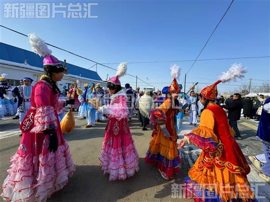2024年2月22日,在昌吉市庙尔沟乡和谐二村,定居牧民载歌载舞耍社火。