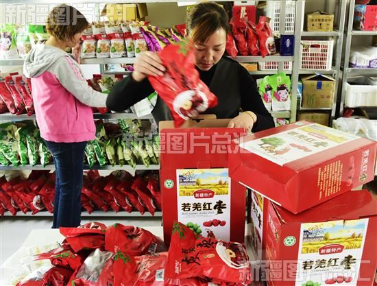 2019年4月22日,若羌县铁干力克镇果勒吾斯塘村的一家电商在包装当地特产。