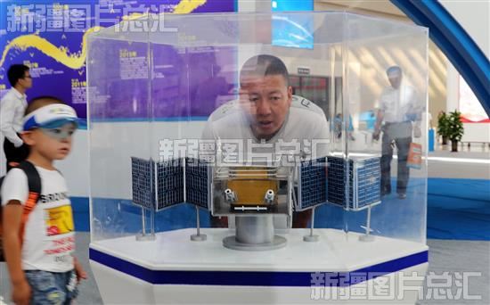 2019年8月31日,在第十届中国科学院—新疆科技合作洽谈会上,一对父子在观看中科院展位前的暗物质粒子探测卫星——悟空模型。