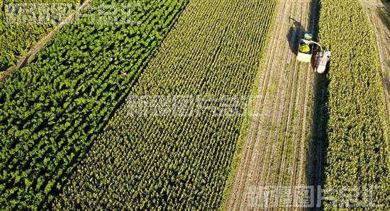 2018年9月13日,在焉耆回族自治县七个星镇的一块条田里,一边地里是正在收割玉米青贮饮料的收割机和拖拉机,一边地里是人们正在采摘色素辣椒(无人机摄)。