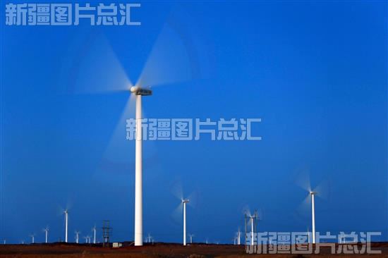 2018年10月1日,国华新疆哈密景峡南风电场一台风电机组在晨曦中迎风起舞。