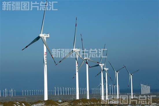 2015年1月14日,在新疆哈密北部三塘湖风区拍摄的风电机组。