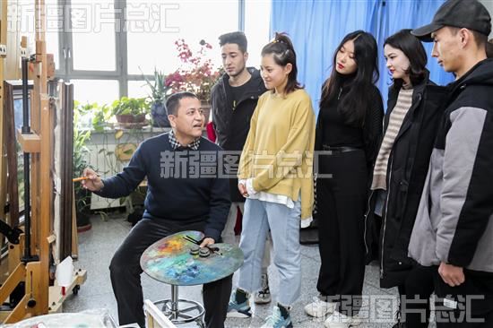 2019年12月30日,阿不来提·马合苏提(左一)在新疆大学纺织与服装学院给学生们讲解石窟文化。